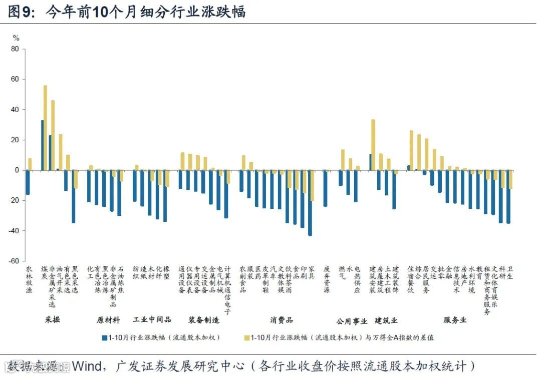 今年前10个月的行业利润结构:绝对利润增速层面,上游采掘、电力、电气机械、交运设备、饮料茶酒和食品领先;相对利润占比层面,上游采掘占比历史新高,装备和公用事业利润占比持平过去5年平均情况,原材料、中间品和消费品利润占比低于过去5年均值。