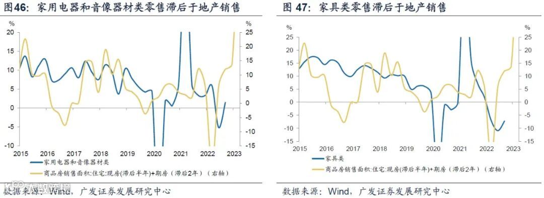以现房住宅销售面积滞后半年、期房销售面积滞后2年左右的合计增速来跟踪地产后周期需求。2015年以来,上述指标与社零中家用电器和音像器材类、家具类地产后周期消费趋势较为一致。