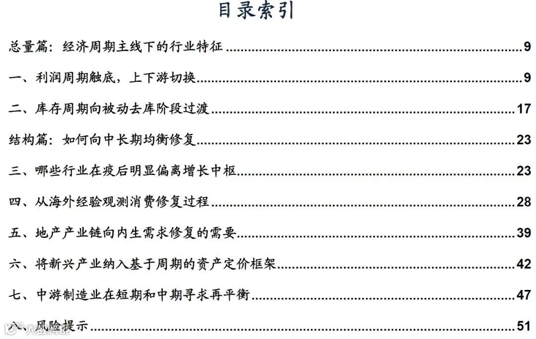 在防疫政策优化“二十条”、“新十条”加快的落地的背景下,我们需要提前站在疫后视角上观察经济变化,中观角度的梳理就显得更为重要。在本篇研究中,我们会先后站在利润周期、库存周期、疫情缺口、产业链线索等四个角度展开。