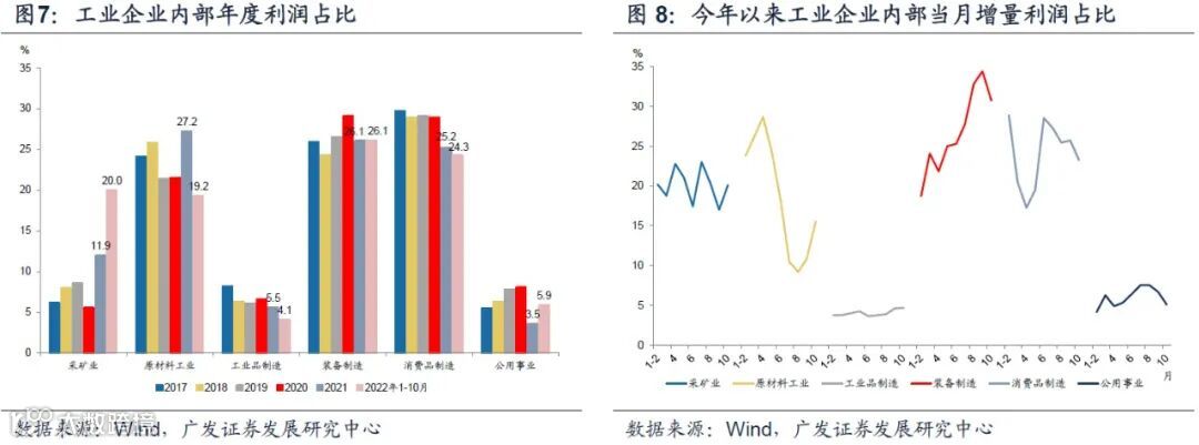 以今年前10个月为整体,上游采掘利润占比20%,为历史新高水平;原材料利润占比19.2%,显著低于去年全年的27.2%和过去5年均值的24%;中间品利润占比4.1%,低于2021年的5.5%和过去5年均值的6.5%;装备制造利润占比26.1%,持平2021年,与过去5年平均水平(26.4%)基本相当;消费品制造利润占比24.3%,低于2021年的25.2%和过去5年均值(28.4%);公用事业利润占比5.9%,显著好于2021年的3.5%,略低于过去5年均值的6.2%。