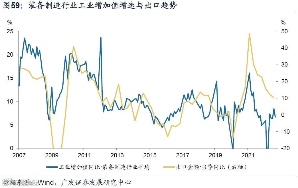 2018年和2022年下半年出口与装备制造行业增加值的背离可能很大程度上可以由基建投资的显著变化解释。2018年出口同比增长9.9%,但基建投资由2017年的14.9%显著下行至2018年的1.8%;2022年1-3季度出口同比分别增长15.6%、12.4%、10.2%,呈现单边走弱趋势;但基建投资1-3季度当季同比分别增长10.5%、8.6%、14.6%。