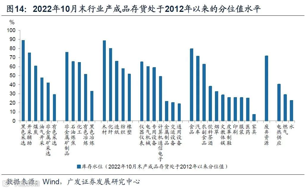 10月末规上工业企业产成品存货同比增长12.6%,自4月高点连续6个月回落,微观企业持续处于主动去库存中。此前2021年11月-2022年2月企业主动去库存、2022年3-4月为疫情影响下的库存被动累积。
