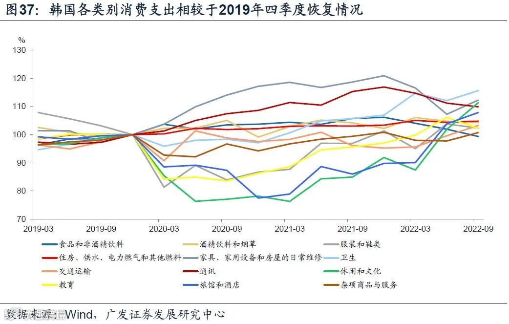 与美国相比,韩国自2021年1季度以来,同样经历了两轮快速的疫情管控优化,分别发生在2021年1-7月、2022年2-4月,2022年4月中下旬开启全面优化进程。对应的,服务消费支出每一轮优化均出现1-2个季度的环比脉冲,与美国不同的是,2020年下半年韩国服务消费受冲击更加显著、持续时间更长,而服务消费修复脉冲在2022年这一轮全面优化阶段表现更强。疫情管控优化后,酒精饮料和烟草,服装和鞋类,卫生,休闲和文化,教育,旅馆和酒店消费支出显著提速,其中休闲和文化、旅馆和酒店增速最快,季度复合增速分别达到6.5%和5.3%。