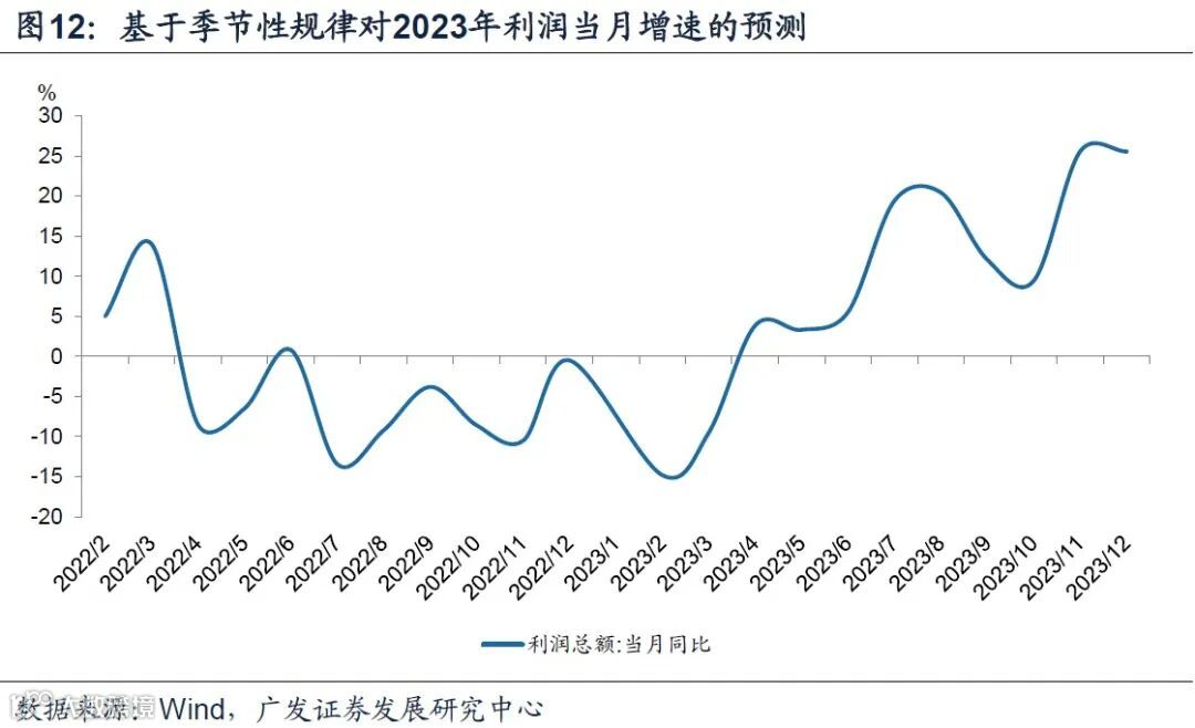 按照当月利润增速的季节性规律(2017-2021年当月环比均值)推算,2023年利润低点出现在一季度,全年呈现前低后高的趋势,7-8月、11-12月的当月利润增速为阶段性高点,全年利润同比7.5%左右。