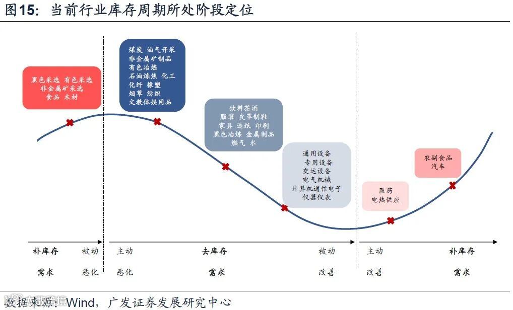 第四,从库存周期角度回溯,2022年整体以“主动去库存”(对应美林时钟衰退期)特征为主,只有3-4月疫情影响下出现库存被动累积。库存仍偏高一定程度上也和疫情影响有关,疫情对于需求端的影响大于供给端,导致库存易累积不易去化。细分行业方面,大部分行业库存水位较高、主动去库特征明显,以上游采掘、原材料、中间品,以及服装、饮料茶酒等消费品为代表;中游装备行业去库压力仍大但营收改善,呈现被动去库特征;农副食品、医药、汽车、电力等少数行业出现补库特征。