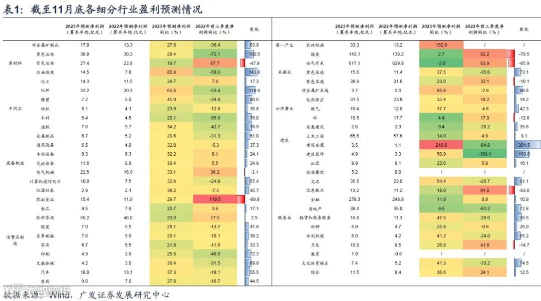 2023年预测净利润增速较快的行业以农林牧渔、非金属矿采选、石油炼焦、化纤、橡塑、建筑安装、建筑装饰、住宿餐饮、交通运输、租赁和商务服务、教育、水利环境和公共设施管理、文化体育娱乐;与今年前三季度净利润同比相比,大部分行业利润增速均有改善;煤炭、油气开采、有色采选、有色冶炼、信息、农副食品、卫生、电气机械等少数行业预测净利润增速低于今年前三季度实际增速。