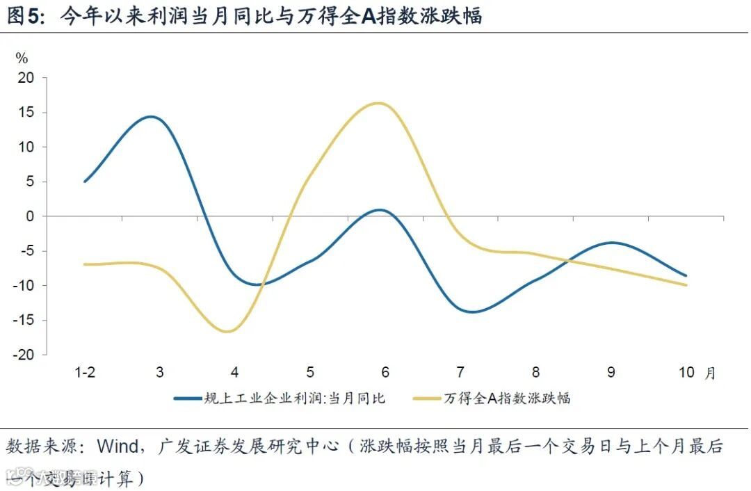 按照当月同比来看,4-6月利润当月同比分别为-8.5%、-6.5%、0.8%;根据累计利润值和同比增速倒推计算当月同比,7-9月分别为-13.4%、-9.2%、-3.8%;10月利润同比下降8.6%。