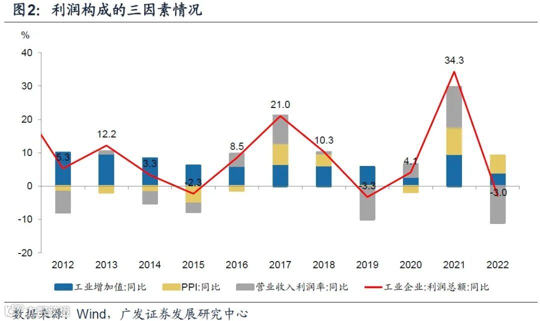 从三因素构成来看,利润同比增速由2021年的34.3%回落至今年前10个月的-3%,其中,工业增加值、PPI、利润率分别贡献了18%、9%和73%。