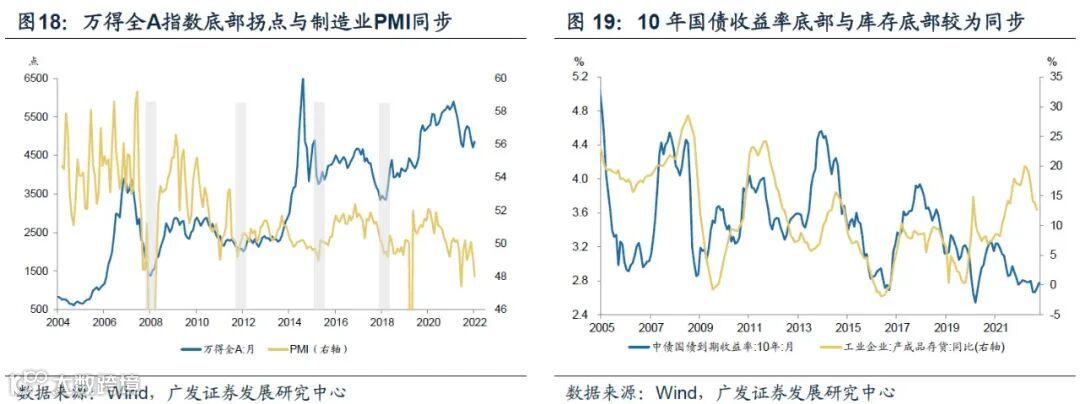 从库存周期角度展望,2023年将逐步向“被动去库存”(对应美林时钟复苏前期)阶段切换。“社融脉冲”这一前瞻指标于2021年10月完成触底,历史上社融脉冲对制造业PMI底部的领先周期最短1个月,最长8个月,本轮疫情冲击和地产中枢下沉使得本轮政策周期向需求传导变长,但随着11月下旬以来疫情防控的优化及地产政策的显著升温,需求底部区域应已基本形成。经验规律之下,万得全A指数底部与制造业PMI底部大致同步;统计有数据以来的5次被动去库阶段,万得全A指数全部上涨。这对应只要是经济进入被动去库存,则权益资产具备明显吸引力。从行业分布看,5次被动去库存阶段消费和成长风格指数跑赢万得全A;最近3次被动去库存周期中,申万行业一级指数全部跑赢万得全A指数的行业包括家用电器、电子、计算机。当然,每轮周期中经济结构都有不同,经验上的行业特征只能当作有限意义上的参考。