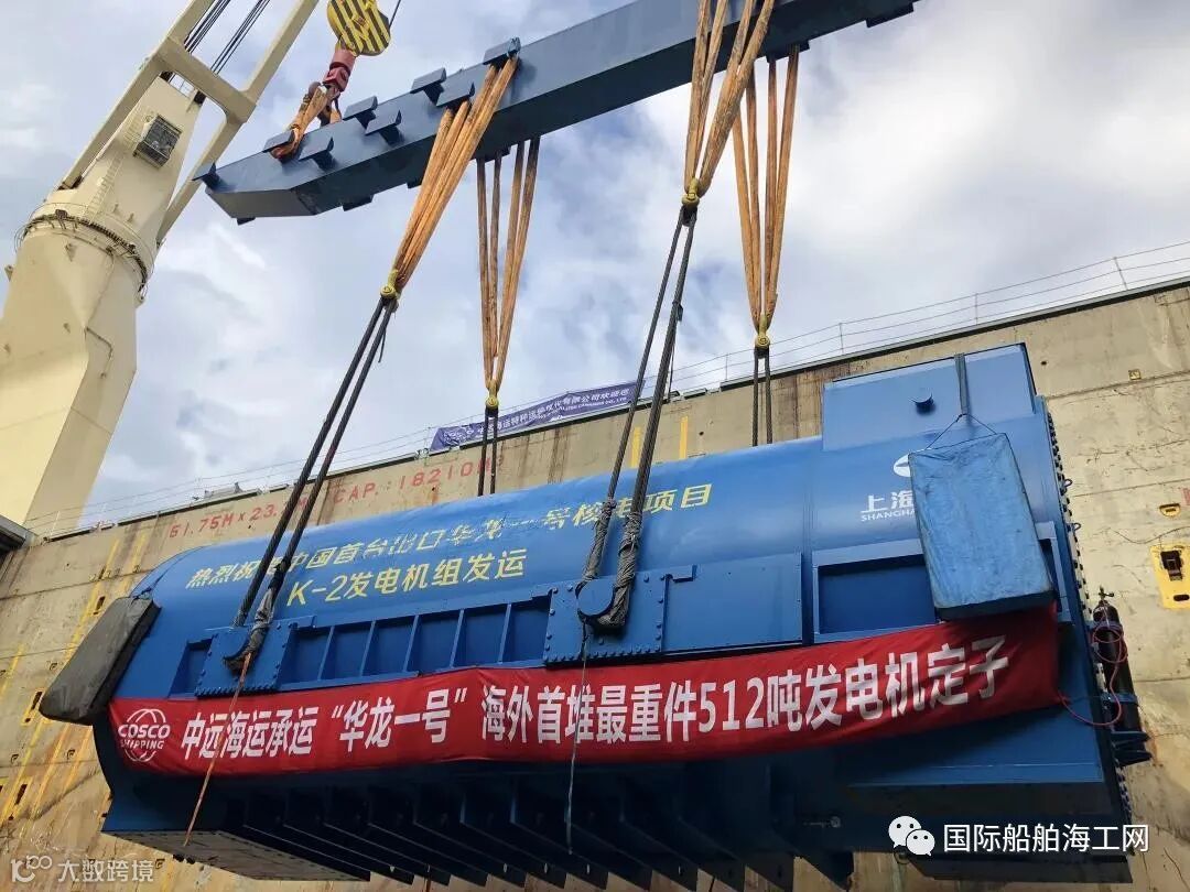 ——2018年,通过精准的船吊并吊作业成功将我国“华龙一号”海外首堆最重件——512吨重的发电机定子吊装上船。
