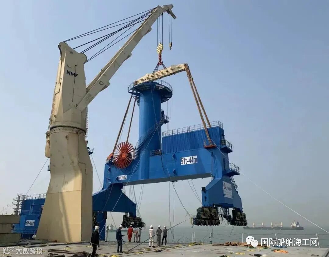 该项目2台门座机均由上部转盘总成和下部门架总成两部分构成。上部转盘总成高45.5米,重550吨;下部门架总成高27.9米,重283吨,整机重量超过800吨。2台门座机运抵卸港后,将由船舶先将下部门架总成卸到码头轨道上,再利用自身船吊将上部转盘总成安装到门架之上,从而为客户实现一步到位的“运输+安装”服务。