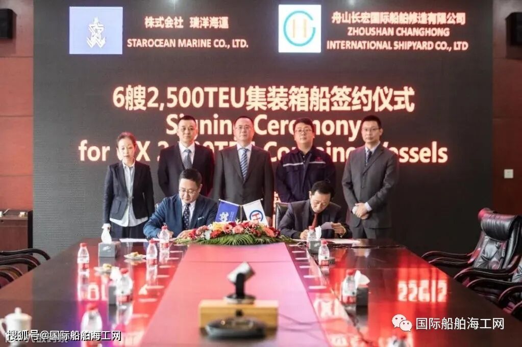 近日,民营船厂长宏国际获得11艘集装箱船建造订单,3月31日,长宏国际与瑞洋海运签订6艘2500TEU集装箱船的新造船合同。此批订单将在2022年至2024年内陆续交付。瑞洋海运董事长原文涛先生、董事原文海先生、舟山长宏国际总裁戴纪明先生、致达船舶管理公司副总经理刘中华先生等参加此次签约仪式。