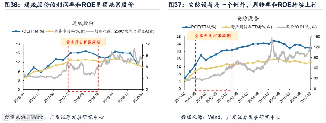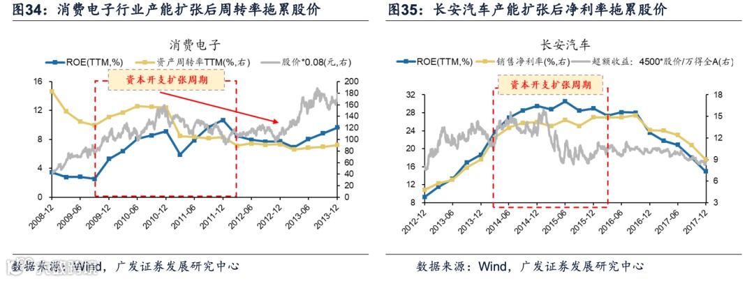 ●高速资本开支扩张,对ROE形成负向传导机制,并带来股价和估值反馈。资产负债率是ROE支撑项;资产增速上行盖过收入增速,周转率率先受损;竞争加剧带来价格战,利润率空间受到挤压;加杠杆难以抵御周转率和利润率的挫伤,ROE见到高点。伴随着盈利能力恶化的隐忧,股价形成负向压制。股价基本上会对周转率/利润率的其一恶化就做出负面反馈,ROE回落预期会加强这一趋势。股价调整在1-1.5年,跌幅多在30-50%。估值挤压幅度更大,多出现50-70%幅度的挤压。