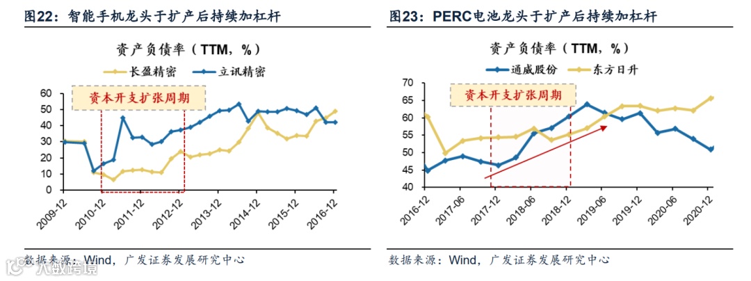 积极的资本开支扩张往往伴随着加杠杆,资产负债率形成ROE的支撑项。扩产需要资金支持,融资加杠杆便是重要途径。智能手机:12年5月,长信科技发行不超过人民币4.5亿元的短期融资券,同年9月,欧菲光发行面值共计2亿元人民币短期融资券。PERC电池:龙头公司亦多通过债务融资来为快速扩产提供资金支撑,如通威2018年间共发行7只短期融资券,募集资金合计40亿元,用于成都和合肥的电池扩产项目。