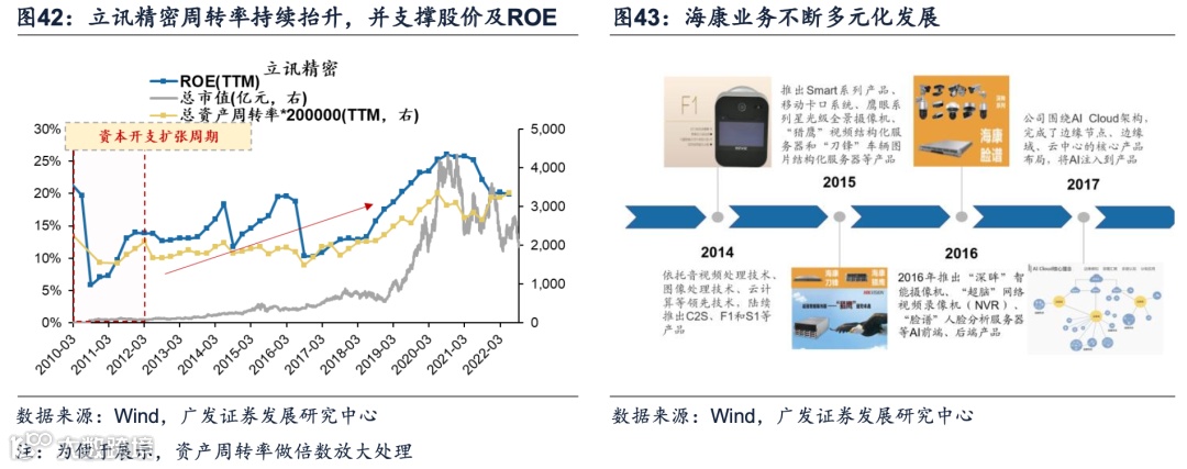 立讯精密、歌尔股份、海康威视等公司,主要是通过横向、纵向一体化整合,打造平台型公司,使得上下游的需求多元化、成本控制力增强,经营稳定性抬升。