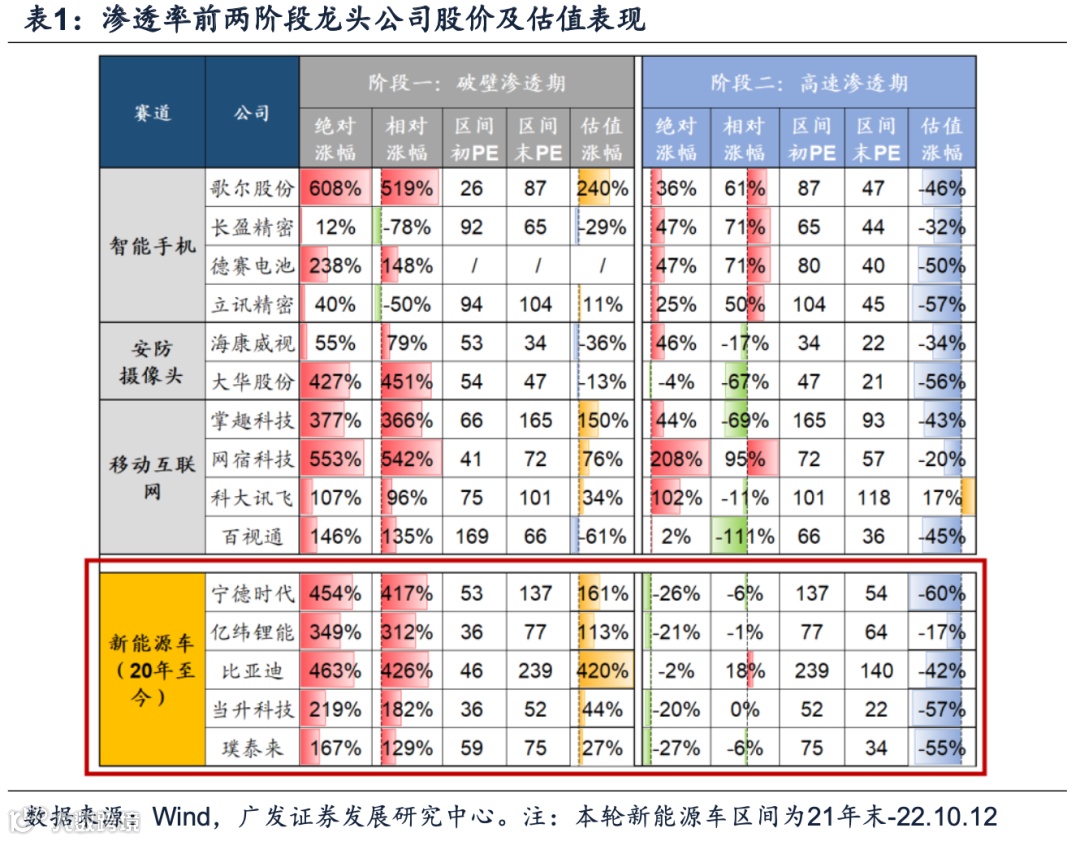 6、“高速渗透期”的第三个关键词是“估值挤压”,2022年典型赛道已经出现。龙头公司相对跑赢但赚钱效应下降,估值消化是主旋律,往往迎来30%-50%的估值挤压,PE回到40-80X中枢。股价可以再创新高,但估值很难回到产业周期的高位;股价创新高的公司赚得是eps的钱、而非拔估值的钱。2022年,光伏、新能源车等产业链出现不同幅度的估值挤压。