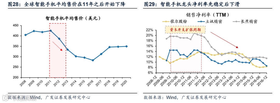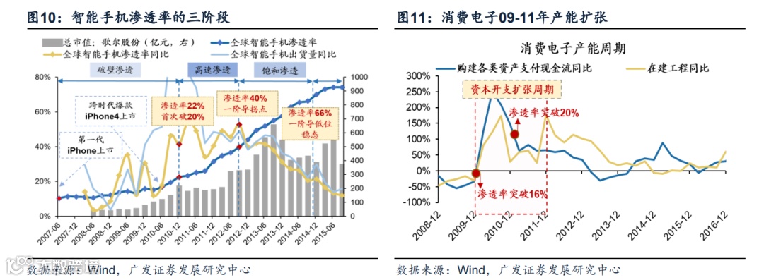 智能手机来看,扩产阶段的终端销量增速在50%以上,2010年iPhone4等爆款产品掀起全球浪潮后,当年iPhone全年出货量达到4748.7万台,同比增长89.2%,其中10Q3-Q4全球智能手机出货量同比增速高达97.4%和88.0%。11年全球智能手机出货量增速录得48.5%,增速有所下滑但仍在相对高位。