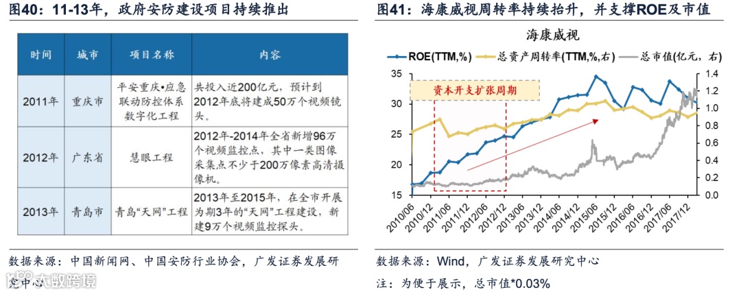 11年“平安城市”等政策不断推出下,政府采购需求稳定,使得龙头公司周转率、股价均持续抬升。政府采购支撑安防需求高增,地方政府订单不断。例如11年重庆市政府与海康威视共计签署了共计77亿元的42个建设合同,13年广东省启动“慧眼工程”,围绕平安城市建设在全省新增96万个视频监控点。