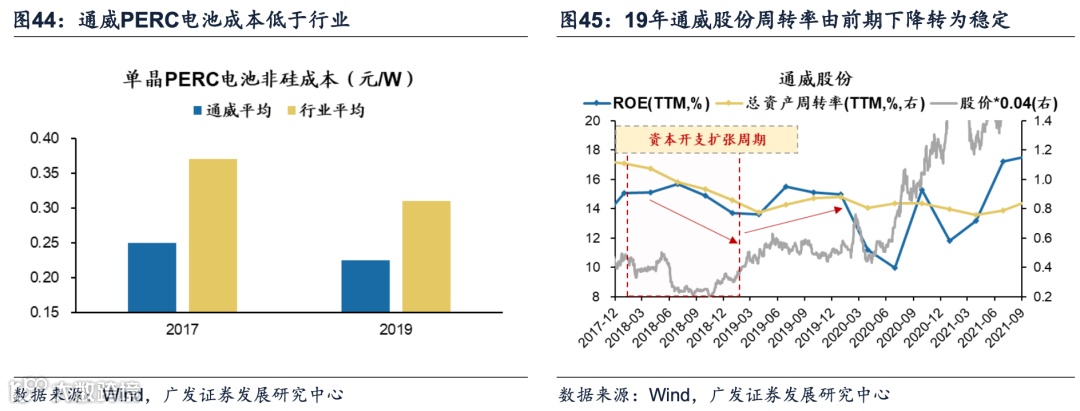 例如PERC电池龙头通威股份是“降本增效”的典型代表,通过产能扩张获取规模经济下的成本优势,通过研发使得转换效率不断提升,由此实现了份额的扩张。通威股份于17-18年通过进行爆发式的产能扩张,抢占市场份额,以此获取了规模经济下的成本优势,由此,2019年公司非硅成本降至0.2-0.25元/W,低于太阳能电池行业平均的0.31元/W。“降本增效”带来了份额扩张,据PV InfoLink,18年通威PERC产量市占率已跃居全国第三。