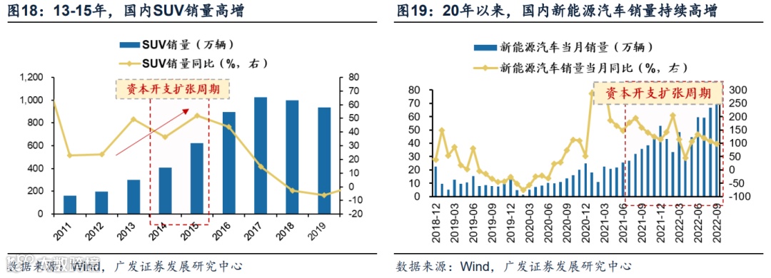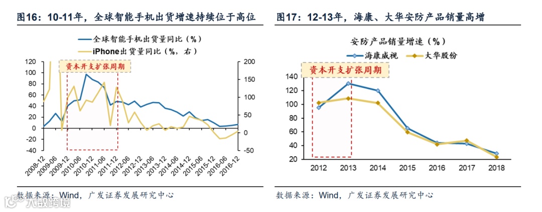 消费电子在10-12年明显加速扩产,安防产业链的扩产高峰在11-12年,SUV的扩产高峰在14-15年,光伏PERC电池的扩产高峰在17-18年。