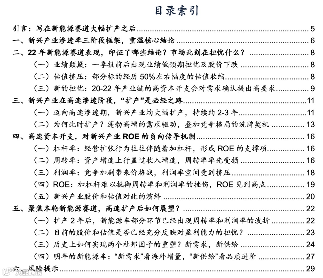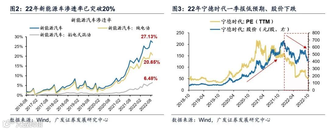 由于新能源车产业链迈入渗透率第二阶段后,未来的市场空间、增长前景等存在诸多担忧,内生盈利能力的恶化隐忧是一个相对的慢变量(分子端),且今年伴随着海外美债利率驱动的贴现率变化(分母端),22年A股市场对于新能源车龙头公司的担心也体现到了股价和估值表现当中。