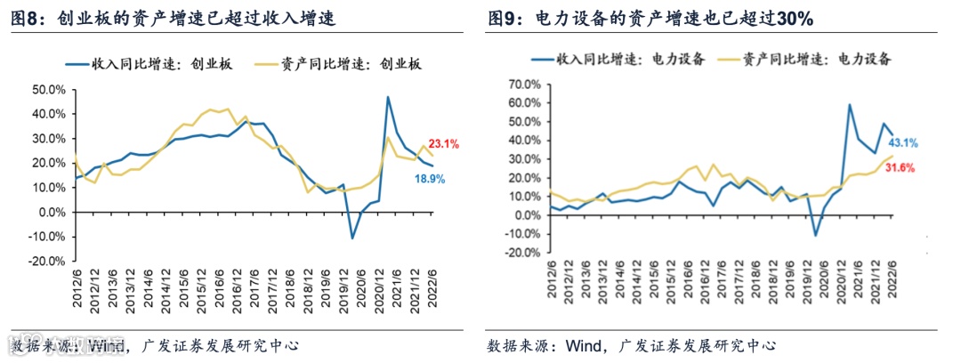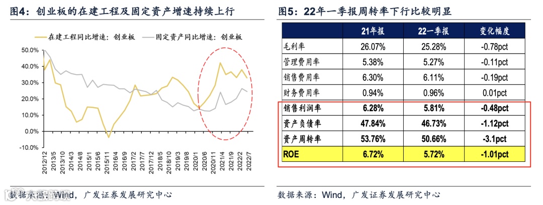 大规模产能扩张之后,如果需求没法持续维持在高速,就会牺牲盈利能力。“在建转固”将会增加供给,如果需求没办法同步维持在高位增长的话,就容易陷入结构性“供给过剩”。22年中报创业板的资产增速(23%)已经超过收入增速(19%),这是创业板周转率下滑的根本原因;电力设备目前的收入增速还很高(43%),但资产增速超过30%,但显然对持续的高收入增长提出了更高的要求。