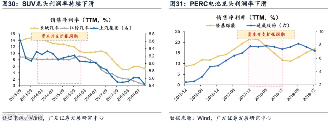 从智能手机、SUV、PERC电池的产业链复盘可见,基本上在大幅扩产的过程中,新兴产业先经历周转率的回落,随后在扩产周期尾声或扩产后看到净利率的下降,在这个过程中大多数行业/龙头公司的ROE开始下滑。