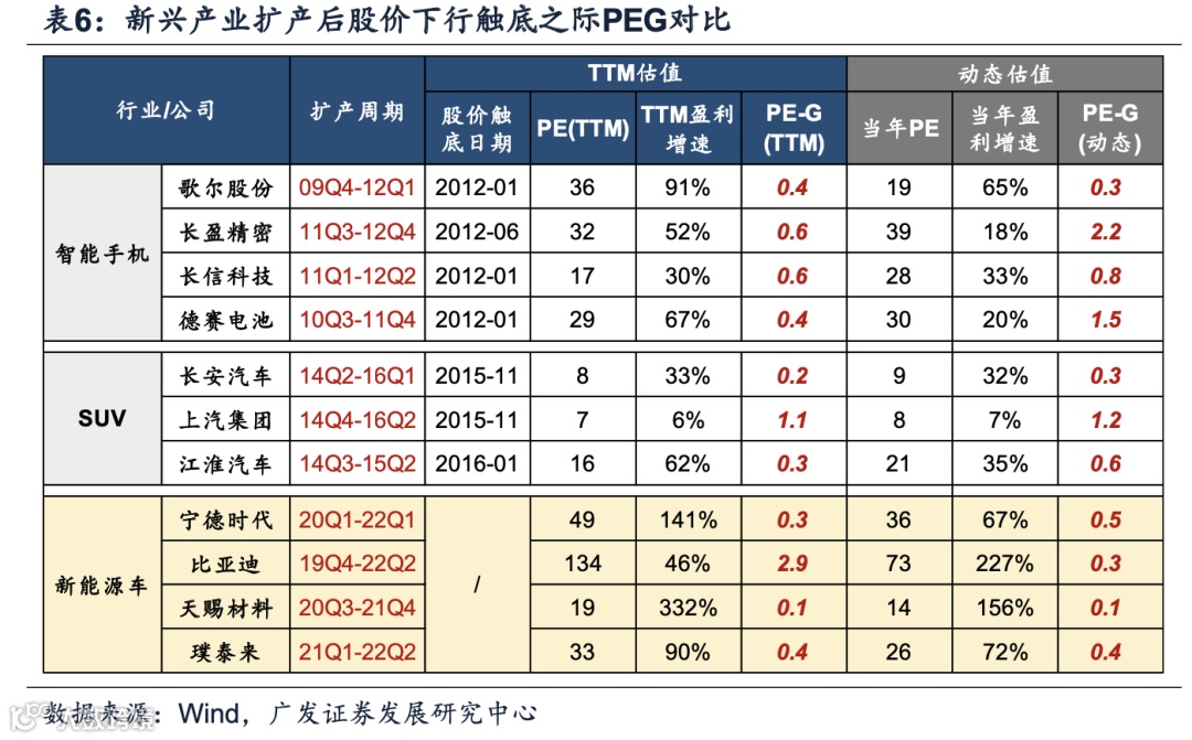 6. 考虑盈利增速放缓,我们用PEG辅助衡量今年以来贴现率上行带来的“杀估值”幅度。在12年1月消费电子调整到位时,歌尔股份当年盈利预测口径的动态PEG回到了0.3。目前新能源车电池及整车22年的动态PEG(基于22年盈利预测)普遍回到了0.3附近水平,从PEG的角度来看对于“杀估值”的反馈也较为充分。