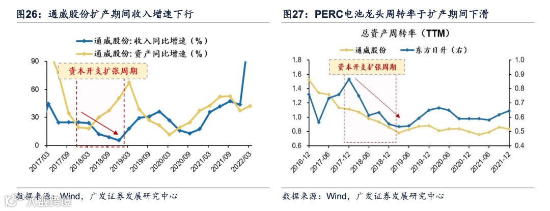 3. 高速资本开支扩张,对历史上新兴产业的ROE形成负向传导机制——积极的资本开支扩张往往伴随着加杠杆,资产负债率形成ROE的支撑项;资产增速上行盖过收入增速,周转率率先受损;竞争加剧带来价格战,利润率空间受到挤压;加杠杆难以抵御周转率和利润率的挫伤,ROE见到高点。