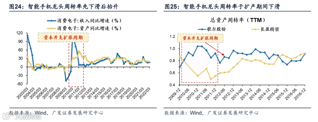 智能手机09-11年产能扩张周期,后续遭遇10-12年的需求回落,阶段性冲击周转率。经过10年的产业需求爆发后,11年全球智能手机出货量增速54.7%、较10年增速下行30pct。需求中枢下移、但产能扩张导致多领域供需紧张局面缓解,歌尔股份、长盈精密在10-12年营收增速下滑且低于资产增速,周转率承压。