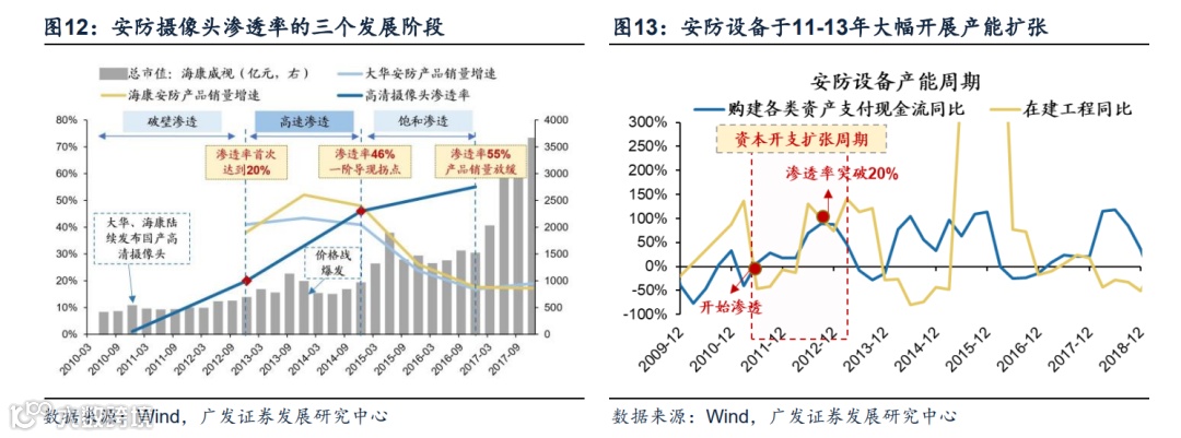 安防摄像头来看,扩产阶段的龙头公司销量增速在100%上下, 2011年《中国安防行业“十二五”发展规划》发布,在“平安城市”、“智慧城市”、“慧眼工程”等顶层设计助力之下,高清安防摄像头得以从城市到乡县的快速渗透。12-14年,龙头公司海康、大华安防产品销量均连续保持在90%-120%;11Q3起安防设备行业大幅扩产,与需求爆发窗口吻合。