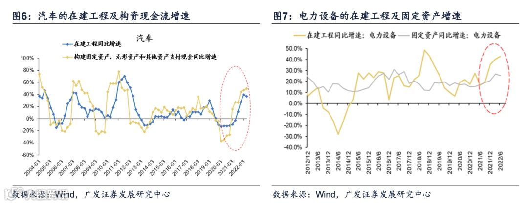 代表行业显示,新能源产业链是A股扩产的主力军,资本开支增速远高于A股整体水平。20年疫情至今,汽车行业的在建工程增速、构资现金流增速从底部上行至22中报的40%-50%水平;电力设备的在建工程增速也超过40%,在建工程进一步转化为资产的确认,固定资产增速也已上行超过20%。