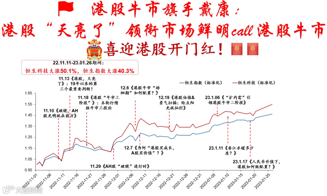 我们自11.10《破晓,AH股光明就在前方》、11.13《港股“天亮了”》提示“我们19年以来的第三次最重要判断”“港股弹性远大于A股”。2022.11.11至2023.01.26恒生科技大涨50.1%,恒生指数大涨40.3%!