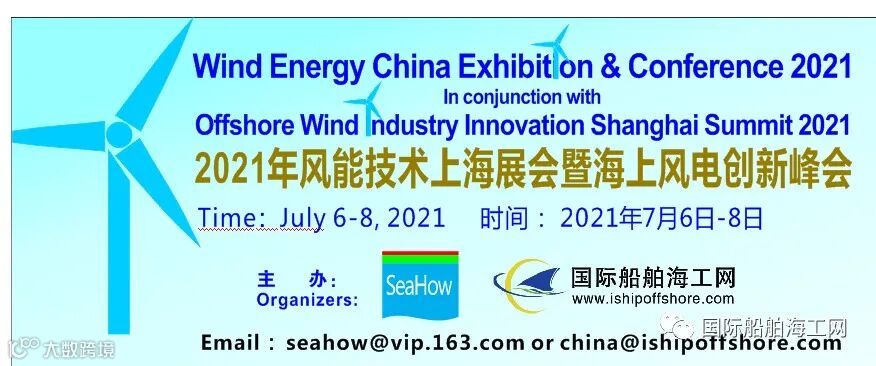 顺应国内外陆地和海洋风能产业技术开发创新、安装、施工、设计、规划、运维、服务、配套和管理等,尤其是风能产业技术装备和工具的设计建造、利用,以及投融资、漂浮式研发、绿色制氢、十四五机会分析、国际合作、产业升级等热点发展趋势,成功地在国内外举办了系列国际交口称赞的专题论坛、峰会、展览的基础上,总部上海的上海帅好文化传播有限公司、新技术时代平台和国际船舶海工网,正在筹备联合相关单位,计划于2021年7月6日-8日三天在上海市举办“2021年风能技术上海国际展会”暨“2021年海上风电产业创新发展上海国际峰会”,展会届时将邀请来自国内外的风电业主、运营商、EPC单位、设备厂商、配套厂家、施工安装、政府部门、船东、船厂、研发单位、设计、贸易、服务和投资等单位代表参加,交流、探讨和分享陆地和海洋风能产业技术创新发展现状、应用和趋势等。咨询报名邮件:china#ishipoffshore.com 或 seahow#vip.163.com