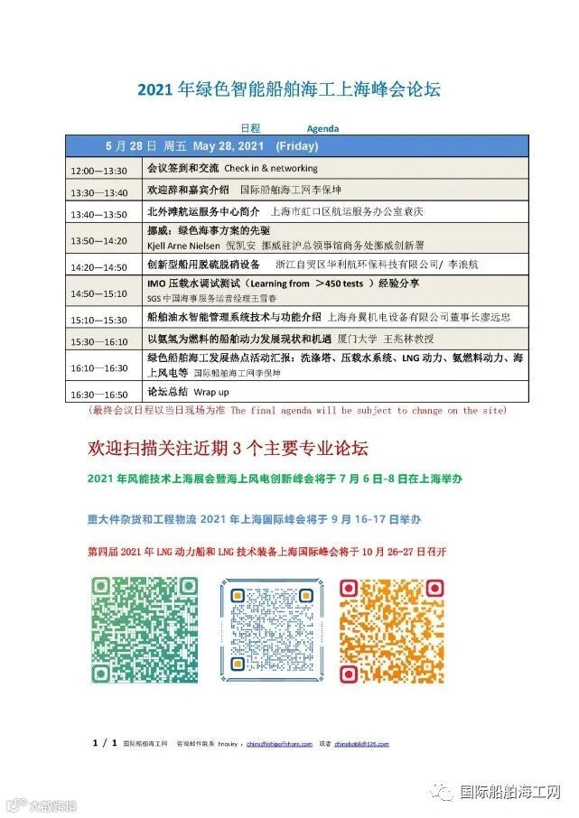 国内外产业关注的 将于2021年5月28日(星期五)下午1:00-5:00在上海虹口区举办的免费的“2021年绿色智能船舶海工上海峰会论坛”,由国际船舶海工网在上海虹口区航运服务办公室和上海虹口区投资促进办公室指导、支持下主办,中英文日程如下。该会议是免费、公开的,因为席位有限和疫情防范要求,本次免费会议将以行业人士优先、先报名先预留,额满为止,有邮件报名并得到主办方邮件确认的代表,请按时前往。会议咨询:china#ishipoffshore.com 或 seahow#vip.163.com