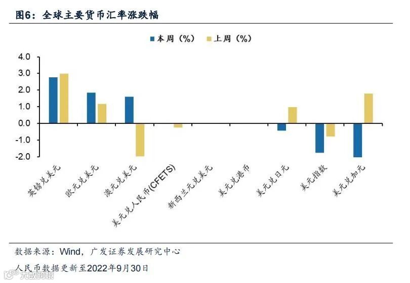 (1)本周(2022.10.03-2022.10.04)美元指数延续下跌,多数国家货币相对美元升值。本周美元指数下跌1.76%。美元兑日元(跌0.42%)、美元兑加元(跌2.31%);英镑兑美元(涨2.77%)、欧元兑美元(涨1.85%)、澳元兑美元(涨1.59%)。