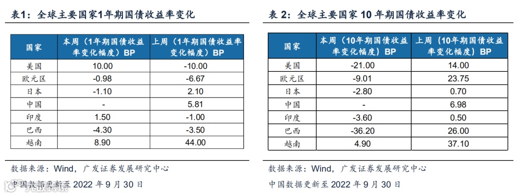 (1)本周(2022.10.03-2022.10.04)美债短端利率有所抬升,长端利率有所下行。1年期国债收益率中,美国(升10.00 BP)、越南(升8.90 BP)、印度(升1.50BP)上行;欧元区(降0.98 BP)、巴西(降4.3 BP)、日本(降1.10BP)下行。10年期国债收益率中,越南(升4.9 BP)上行;美国(降21.00 BP)、日本(降2.80BP)、巴西(降36.2BP)、欧元区(降9.01 BP)、印度(降3.60 BP)下行。