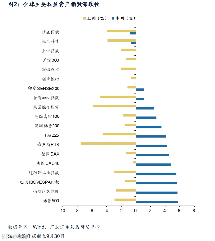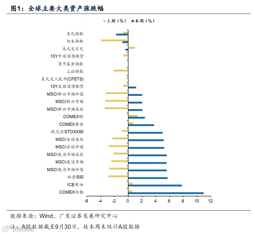 (说明:周报的数据均来自于Wind和Bloomberg。数据截止2022年10月05日。本报告中,上周指2022年9月26日-2022年9月30日的五个交易日;全球大类资产表现跟踪和全球流动性跟踪部分,本周指2022年10月03日-2022年10月04日的交易日;港股市场数据跟踪部分,本周指2022年10月03日-2022年10月05日的交易日)