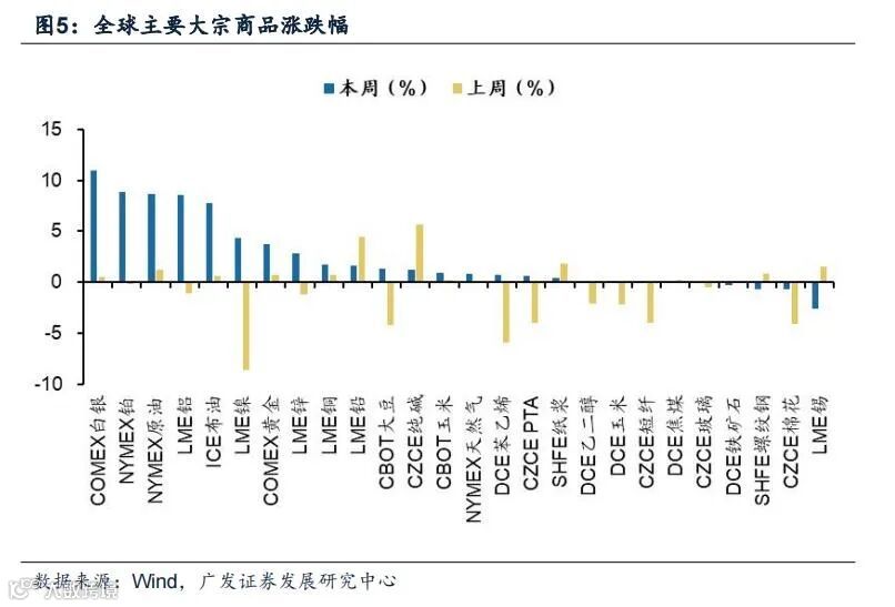 (2)上周大宗商品多数下跌,化工品>能源>金属。上周纯碱(涨5.66%)领涨,其次铅(涨4.41%)、纸浆(涨1.83%)等均显著上涨。镍(跌8.60%)领跌,其次是苯乙烯(跌5.88%)、大豆(跌4.19%)、棉花(跌4.11%)、PTA(跌3.96%)。
