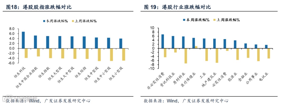 (1)本周(2022.10.03-2022.10.05)港股全线上涨。截至10月5日,本周恒生指数收涨5.02%,恒生科技收涨6.82%。上周港股整体下跌,恒生指数收跌3.96%,恒生科技收跌3.89%。