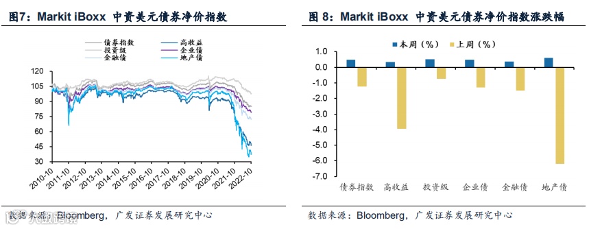 (1)本周(2022.10.03-2022.10.04)Markit iBoxx中资美元债券净价指数有所回升,细分项普遍上行。本周债券指数(涨0.49%),其中高收益(涨0.33%)、投资级(涨0.52%)、企业债(涨0.48%)、金融债(涨0.38%)、地产债(涨0.59%)。上周债券指数(跌1.23%),其中高收益(跌3.93%)、金融债(跌1.49%)、地产债(跌6.19%),投资级(跌0.75%)、企业债(跌1.28%)。