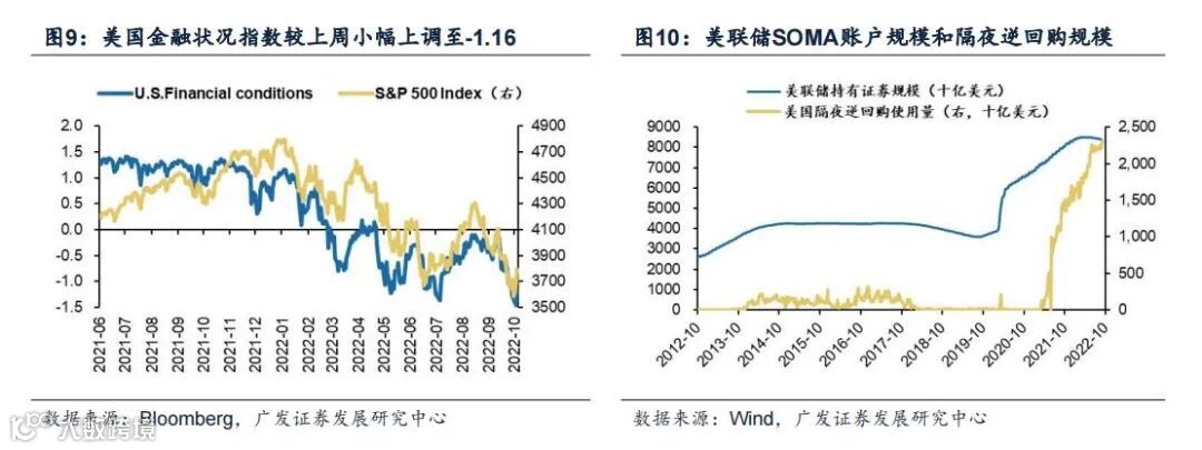 (1)美联储量价配合,货币政策紧缩持续。美东时间9月21日,美联储公布9月议息决议,宣布上调联邦基准利率75BP至3-3.25%,致力于控制通胀水平回到2%目标,符合市场预期。6月以来,美国进入量价配合的紧缩阶段,9月起缩表规模上限提高至950亿美元(600亿国债+350亿MBS和机构债)。但截至10月04日,美联储隔夜逆回购使用量仍达2.233万亿美元,可作为“缓冲垫”对冲缩表带来的影响。