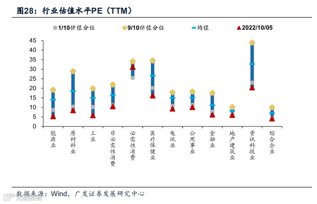 (4)港股行业估值偏高的是必需性消费、资讯科技业,PE(TTM)分别为31.20、20.39,位于历史71.4%、2.7%分位数;估值偏低的是能源业、工业,PE(TTM)分别为5.28、5.74,分别位于历史0.15%、0.15%分位数。