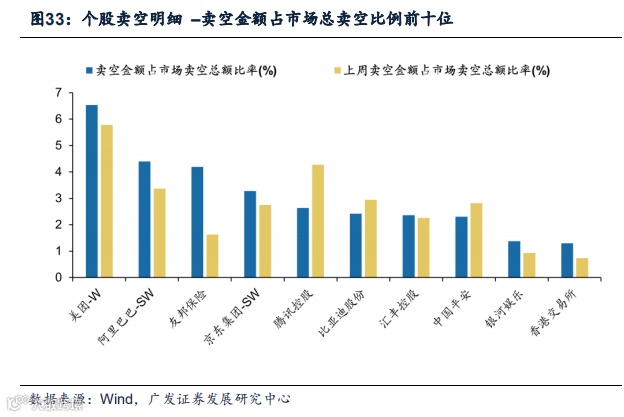 (2)10月5日共636只港股被卖空(9月30日为656只),总卖空金额为158亿港元(9月30日为127亿港元),其中卖空金额超1亿港元的个股有33只(9月30日为31只)。本周卖空金额占市场总卖空比例居前五的个股包括美团、阿里巴巴、友邦保险、京东集团、腾讯控股,其中美团6.54%处于第一位;上周卖空金额占市场总卖空比例居前五的个股为美团、腾讯控股、阿里巴巴、比亚迪股份、中国平安,其中美团5.78%处于第一位。