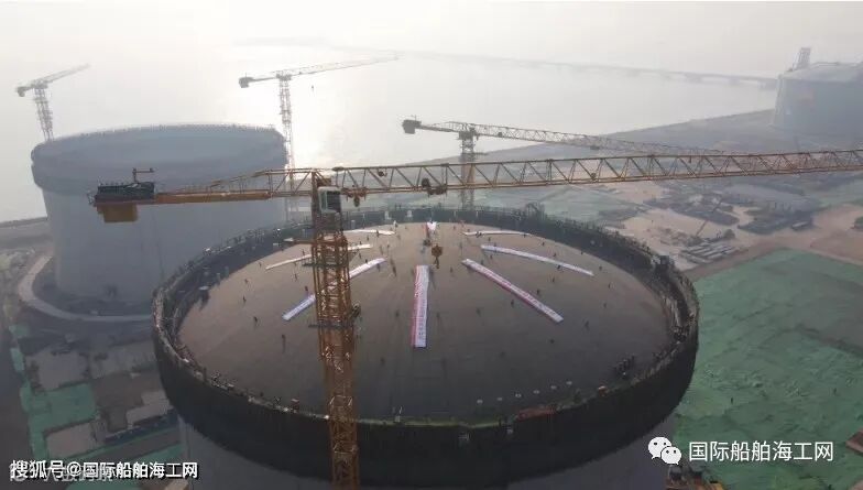 2020年12月27日上午11时16分,曹妃甸公司唐山LNG项目3#储罐拱顶升至目标位置,全程上升43.216米,历时210分钟。