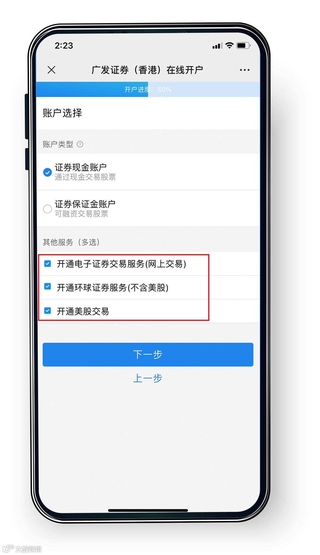 进入开户系统界面后,根据提示填写相关信息,在“账户选择” 页面下的 “其他服务(多选)”处 ,勾选全部选项(如下图显示),即可开通美股在线交易服务。