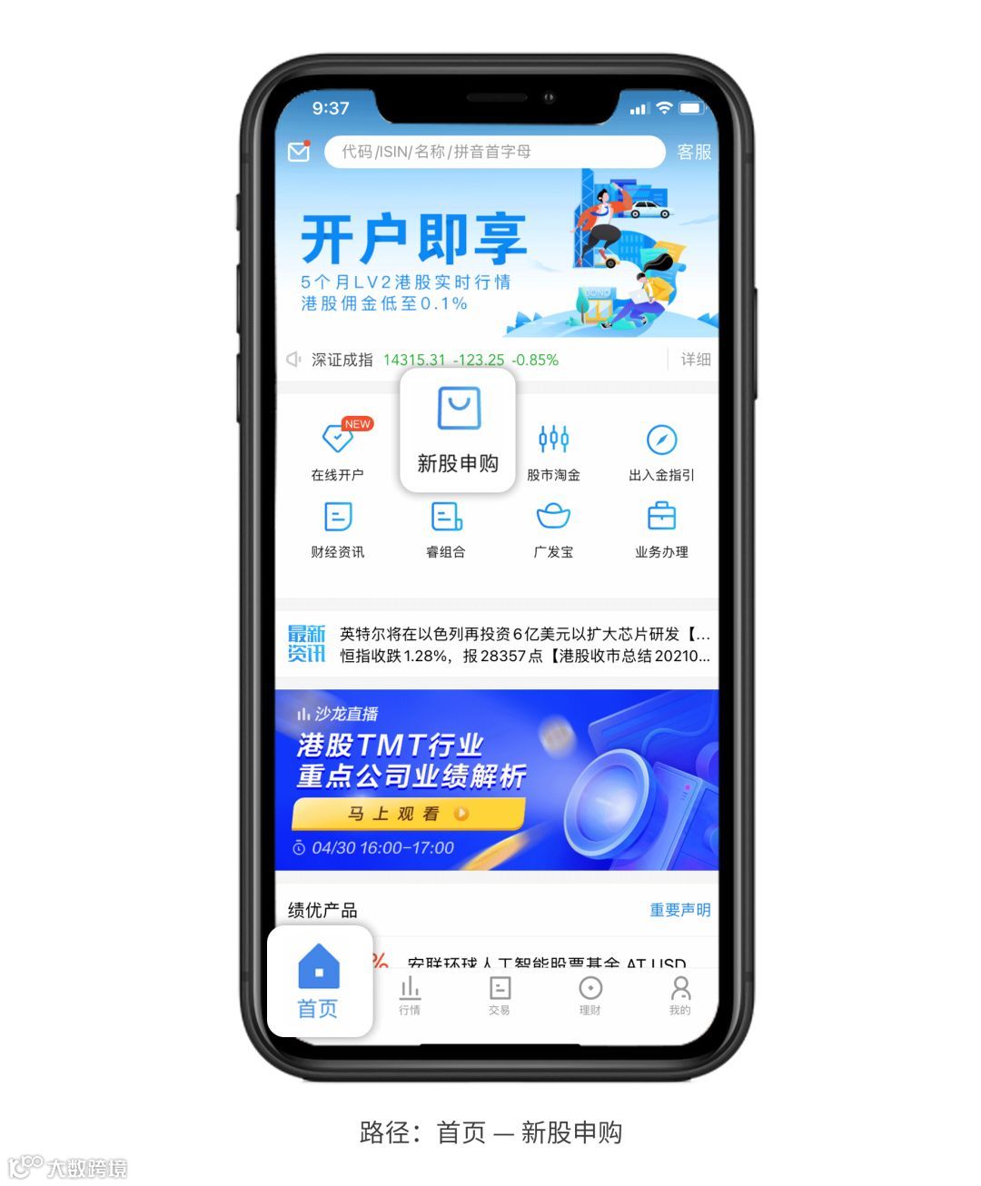 进入“易淘金国际”APP,登录个人交易账户,在APP首页界面的上方,点击选择“新股申购”,进入新股申购页面。