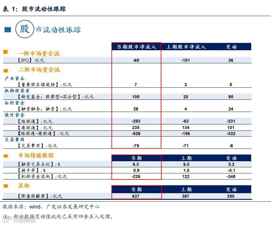 二级市场:上周两融规模扩张,新发基金规模扩张,A股二级市场总体呈现资金净流出。流入方面,国内基金(股票+混合)新发行105亿元,两融融资增加28亿元,重要股东增持7亿元;流出方面,北上资金流出293亿元,南下资金流入235亿元,交易费用79亿元。