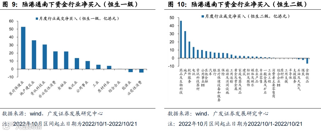(5)陆港通北上资金流入净额:上周陆股通北上资金净流出293亿元,前一周净流出63亿元。截至2022年10月21日,2022年10月北上资金净流出356亿元。上周净流入行业前五名是煤炭、计算机、通信、美容护理、国防军工,净流出行业前五名是食品饮料、电力设备、非银金融、银行、家用电器。