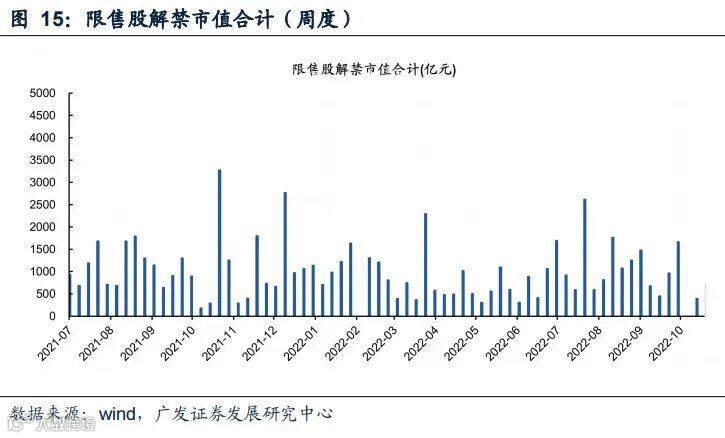 (1)限售股解禁:上周限售股解禁637亿元,前一周限售股解禁387亿元,预计本周限售股解禁605亿元(以2022年10月21日收盘价计算)。